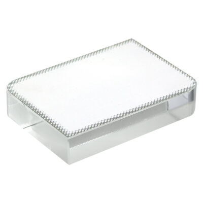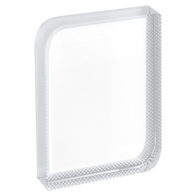 Trofeo cuadrado de Cristal para Sublimación, sobre soporte acrílico transparente. Permite distintas posiciones del cristal sobre el soporte. Presentación en