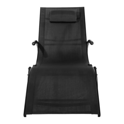 Reposera mecedora negra con apoya-brazos, modelo “Ventus”. Estructura de Aluminio color negro, asiento de Textilene negro. Descanso y relajo verdaderos.